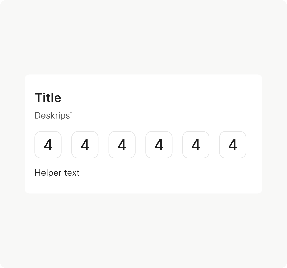 Gunakan helper text hanya untuk instruksi atau koreksi penting. Jangan menampilkan teks yang terlalu panjang atau berulang, pastikan fokus pada konteks, misalnya: "Kode OTP terdiri dari 6 digit angka."